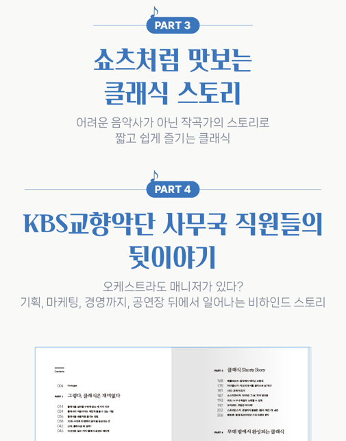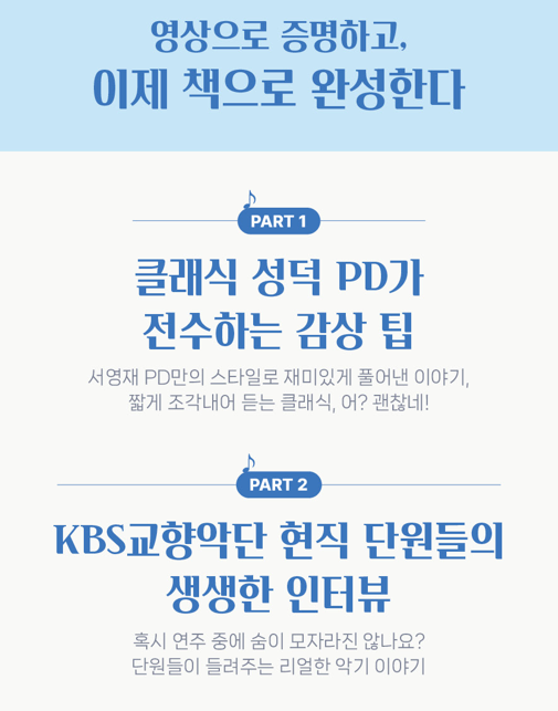 클래식 '성덕'인 서영재 PD가 전수하는 감상 팁과 더불어 KBS교향악단 현직 단원들의 생생한 인터뷰, 쇼츠처럼 맛보는 클래식 스토리, KBS교향악단 사무국 직원들의 뒷이야기까지 누구나 친근하게 클래식에 다가갈 수 있는 이야기들을 가득 담았다. 특히 독자의 이해를 돕는 풍성한 사진 자료는 물론, 텍스트만으로는 다 전할 수 없는 현장의 감동을 즉석에서 확인할 수 있도록 연주 영상 QR코드를 본문 곳곳에 배치했다. 눈으로 읽고 귀로 바로 듣는 이 입체적이고 친절한 안내서를 따라가다 보면, 클래식이라는 미지의 세계는 어느덧 당신의 가장 즐거운 놀이터가 되어 있을 것이다.