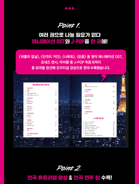 애니메이션의 감동을 손끝으로 다시 느끼고 싶은 순간, 좋아하는 곡을 직접 연주해보고 싶은 모든 이들에게 이 책은 가장 가까운 시작점이 되어준다. 인기 애니메이션 OST와 J-POP 32곡을 통해, 듣는 음악을 넘어 ‘연주하는 즐거움’까지 경험할 수 있는 특별한 플레이리스트가 펼쳐진다.