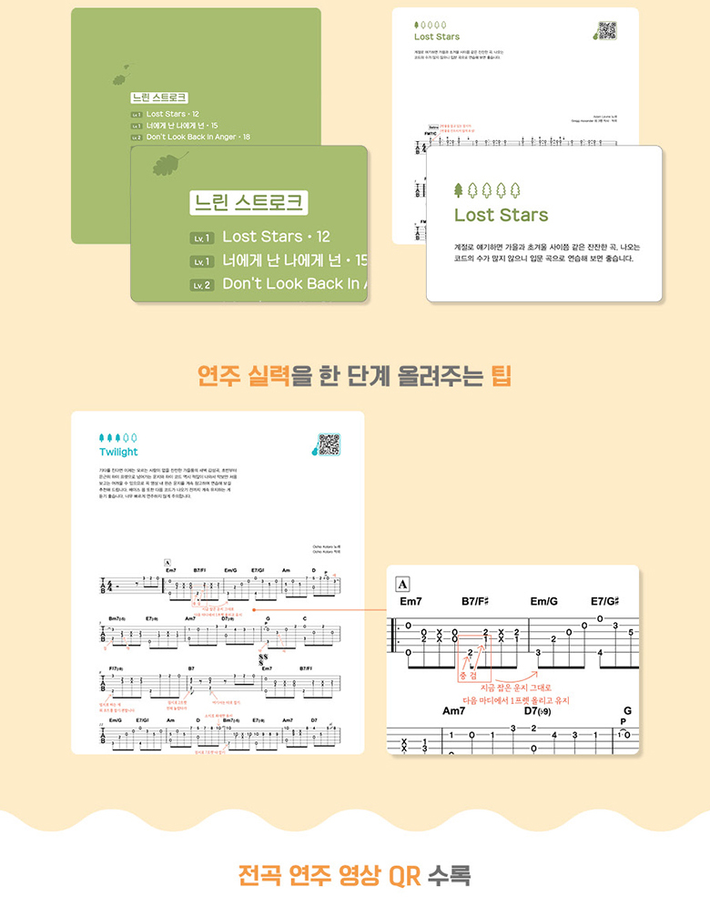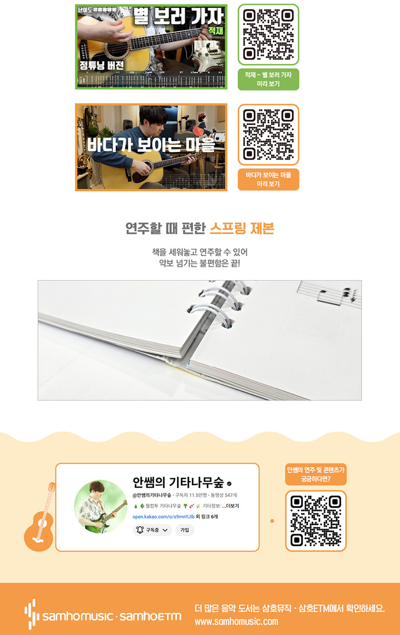 QR코드를 통해 전곡 연주 영상을 바로 확인할 수 있어, 정확한 리듬과 주법을 눈으로 익히며 연습할 수 있는 점도 큰 장점이다. 또한 연주 시 펼침이 편한 스프링 제본으로 제작되어 실용성까지 놓치지 않았다. 통기타를 사랑하는 초보자부터 중급자, 오랜만에 기타를 다시 잡는 연주자까지 모두를 고려한 이 악보집은 체계적인 연습과 꾸준한 실력 향상을 원하는 연주자들에게 유용한 길잡이가 될 것이다.