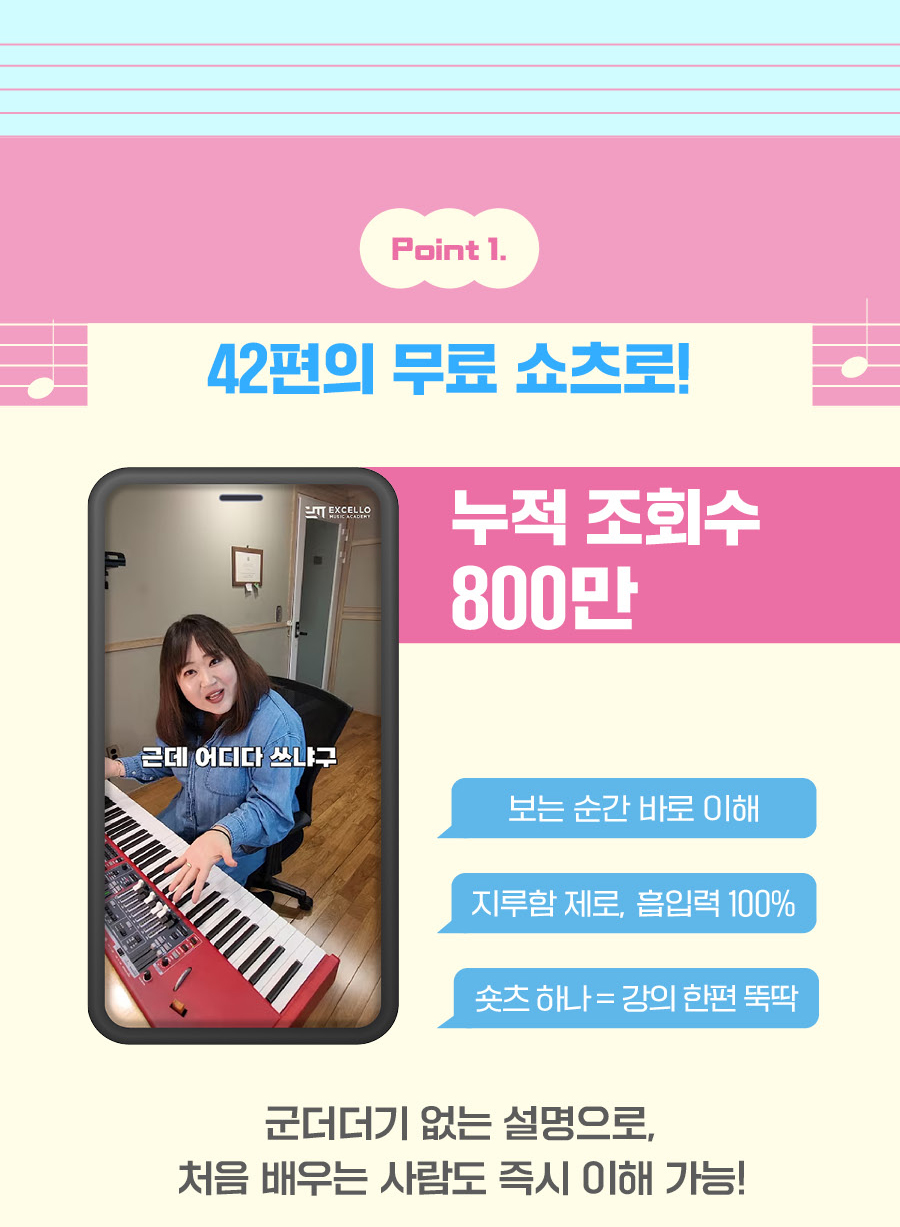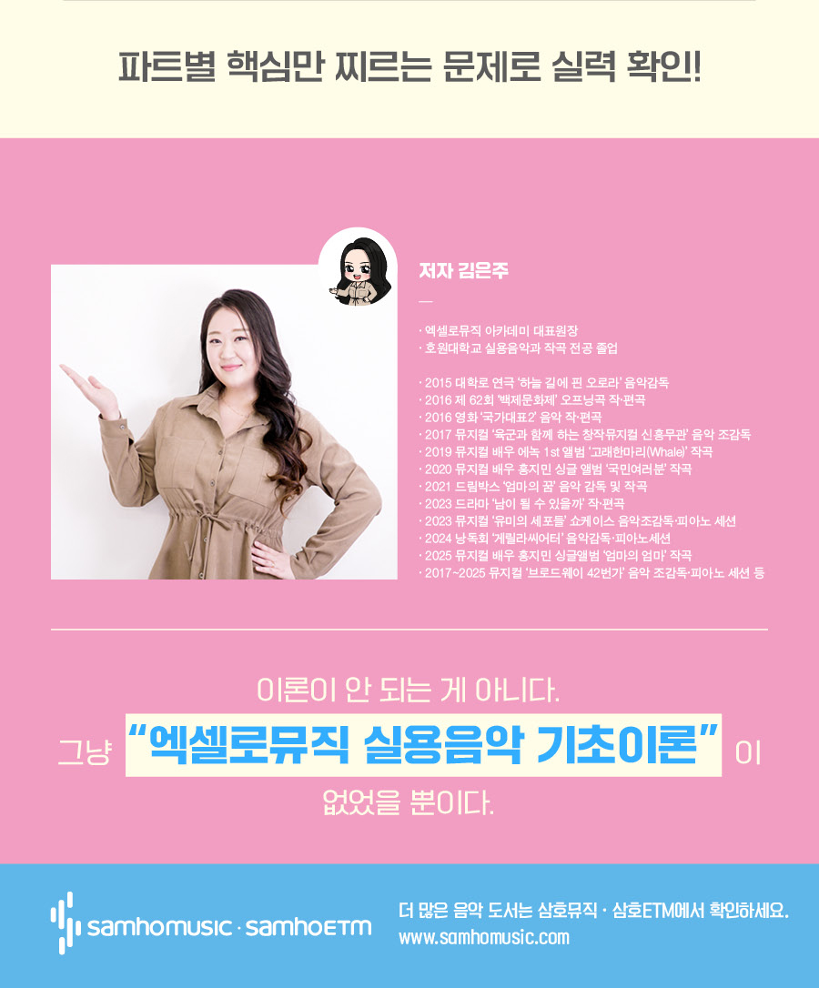 《엑셀로뮤직 실용음악 기초이론》은 “기초지식 없이도 3분이면 이해된다”는 목표 아래 제작되었다. 불필요한 내용은 과감히 덜어내고, 꼭 필요한 포인트만 선별하여 담아낸 실용음악 기초이론 입문서다.