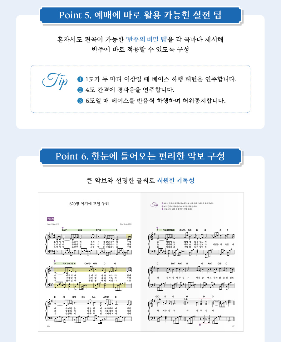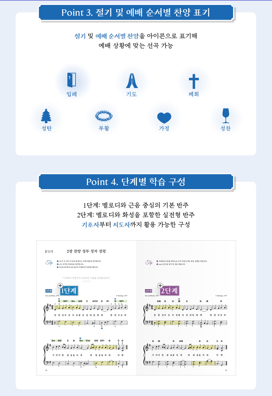 또한 조성과 장 순서에 따른 목차 구성, 절기와 예배 순서를 나타내는 아이콘 표기로 원하는 곡을 빠르게 찾을 수 있습니다. 각 곡은 1단계와 2단계로 나누어 수록되어 있어 기초자와 지도자 모두 활용할 수 있으며, 곡별 전주 구간을 노란색 띠로 제시하여 예배 현장에서의 활용도를 높였습니다. 더불어 혼자서도 다양한 반주를 만들 수 있도록 ‘반주의 비밀 팁’을 함께 수록하여 실제 반주에 바로 적용할 수 있는 아이디어를 제공합니다.