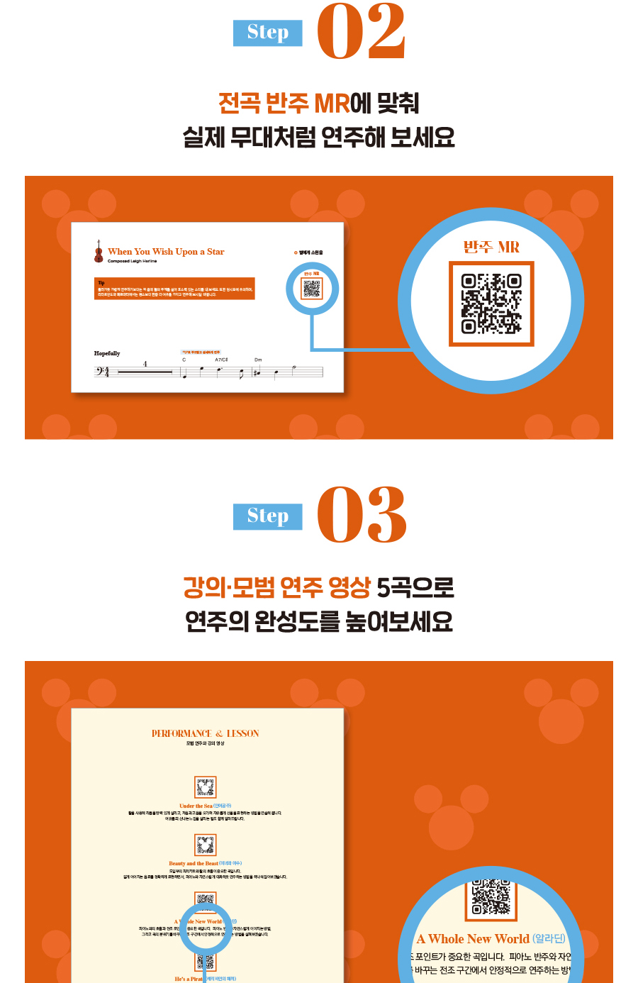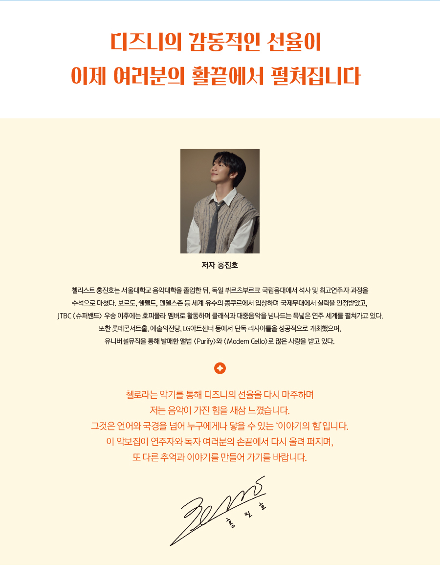 각 곡에는 연주 포인트와 팁이 함께 수록되어 있으며, 그중 5곡은 홍진호 첼리스트의 강의 및 모범 연주 영상 QR을 통해 직접 레슨을 받는 듯한 생생한 연습·연주 경험을 선사한다. 또한 디즈니 작품의 스틸컷을 함께 실어, 시각적으로도 디즈니의 감성과 여운을 느낄 수 있다.