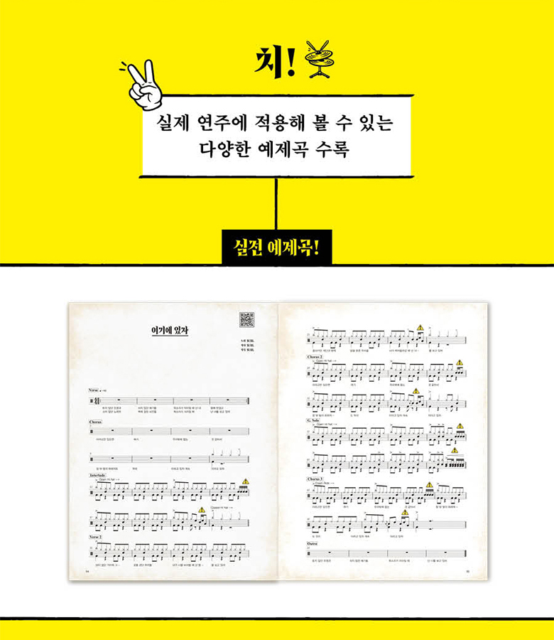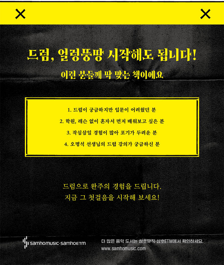 옆에서 친근하게 말을 걸어오는 듯한 설명부터, 드럼 선생님에게 1:1로 레슨을 받는 듯한 강의 영상까지. 술술 읽히고, 손이 먼저 움직이게 만드는 드럼 교본이 여러분과 함께한다면 이제 더 이상 미룰 이유도, 포기할 이유도 없을 것이다.
