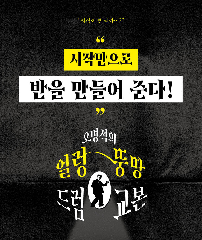 실제 ‘드럼 선생님’이기도 한 오명석은 현장에서의 연주와 레슨 경험을 바탕으로 강의 영상과 예제곡, 그리고 실전 노하우 팁을 하나의 커리큘럼으로 구성하여 제아무리 ‘프로 작심삼일러’라도 끝까지 완주할 수 있도록 세심히 설계했다.