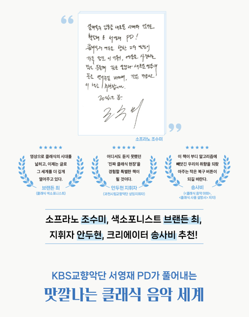 "영상으로 클래식의 시대를 넓히고, 이제는 글로 그 세계를 더 깊게 열어주고 있다."_ 브랜든 최(클래식 색소포니스트)