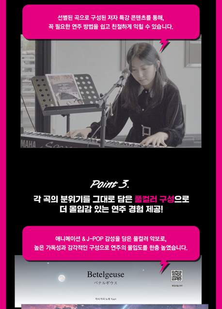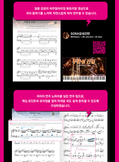 수록된 곡들은 너무 어렵지 않은 난이도로 편곡되어, 취미로 피아노를 즐기는 연주자도 자연스럽게 완곡의 즐거움을 느낄 수 있도록 돕는다. 또한 혼자서도 충분히 연주를 완성할 수 있도록 실용적인 연주 팁을 함께 담았으며, 전곡 튜토리얼 영상은 QR 코드로 연결되어 실제 연주 흐름과 표현을 직관적으로 익힐 수 있다.